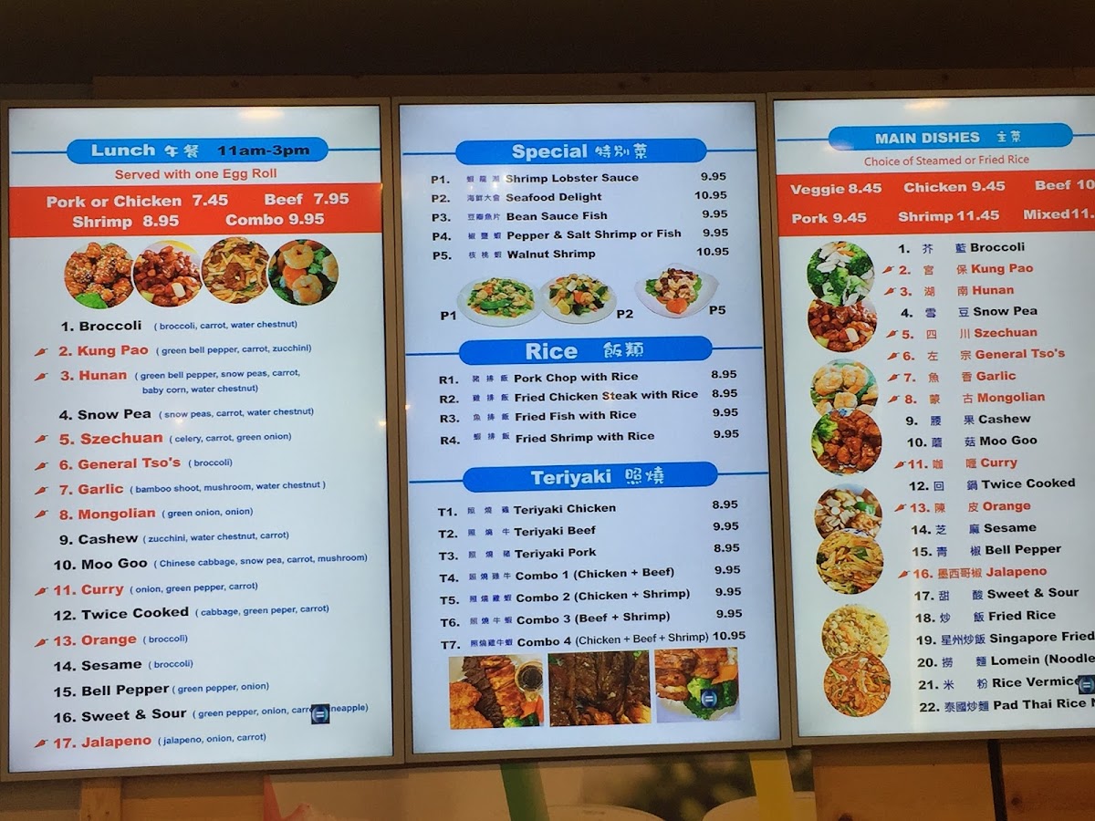 Shrimp stir-fried with broccoli, carrots, mushrooms, and baby corn, served in a spicy Hunan sauce.